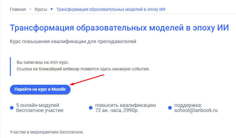 для преподавателей: «Трансформация образовательных моделей в эпоху ИИ», нажмите «Перейти на курс в Moodle» (если кнопки нет, авторизуйтесь).